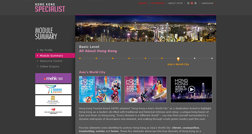 - Upgraded PartnerNet with 13 customised market versions in eight languages to facilitate business-building activities between the local and international travel trade, and introduced a special online training programme, called Hong Kong Specialist, to equip frontline staff in the local and overseas travel trade with essential knowledge of Hong Kong.
