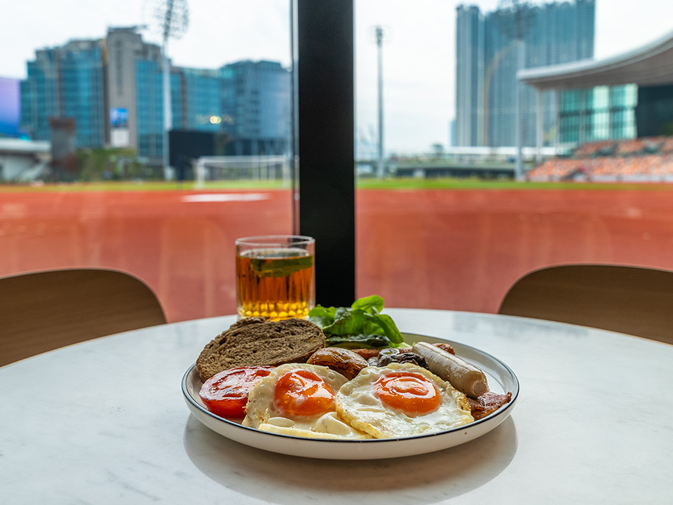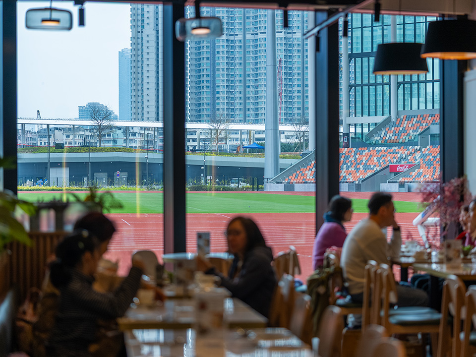 This health-conscious local eatery’s location inside Kai Tak Mall 3, next to the Health and Wellness Centre, means customers get a great view of the Kai Tak Youth Sports Grounds. Being on the ground floor, the cafe is only separated from the sports pitch by large windows. The orange-dominant bleachers and track make for a colourful background when taking food photos.