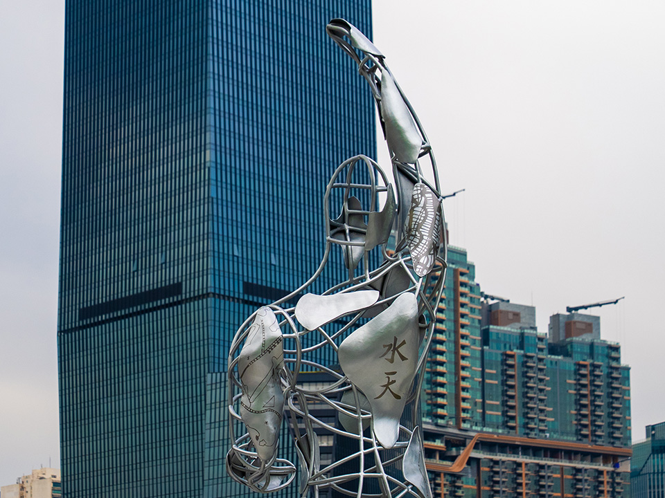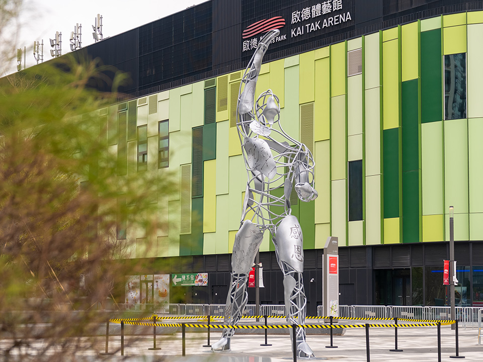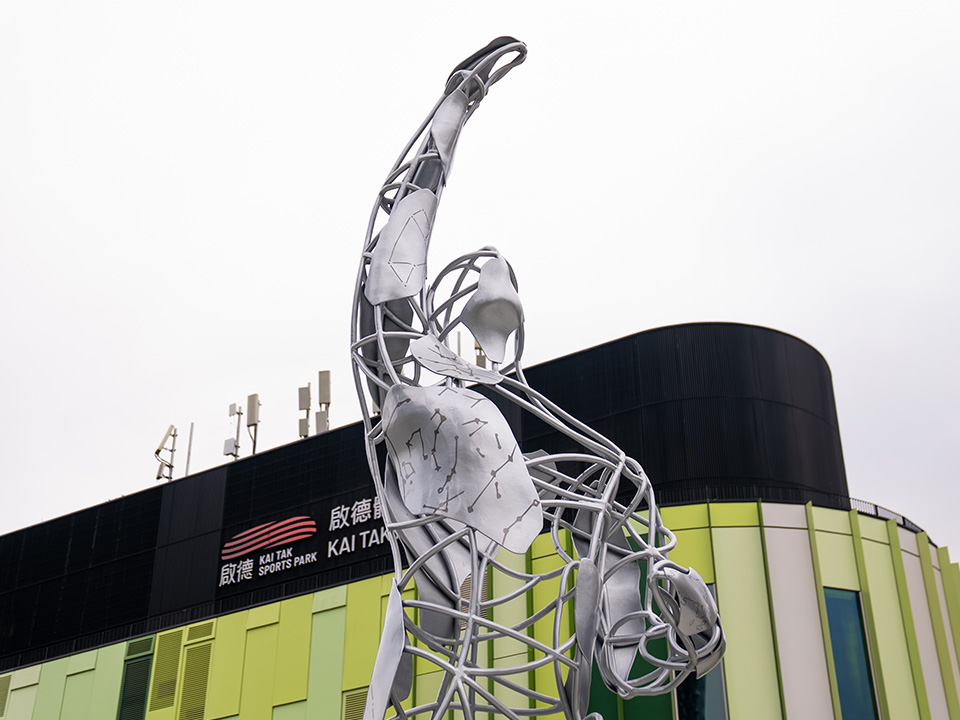 Another piece of art in the complex is the ‘Water/Sky’ sculpture by Australian artist Dominique Sutton, standing at the Water Sky Fountain. The eight-metre aluminium figure has its head held high hopefully with an arm stretched skyward – representing the ambition and drive of Hong Kong athletes. The metal surface of the sculpture is etched with symbols relevant to Hong Kong, and when illuminated at night, its shadows form the loose shape of a map.