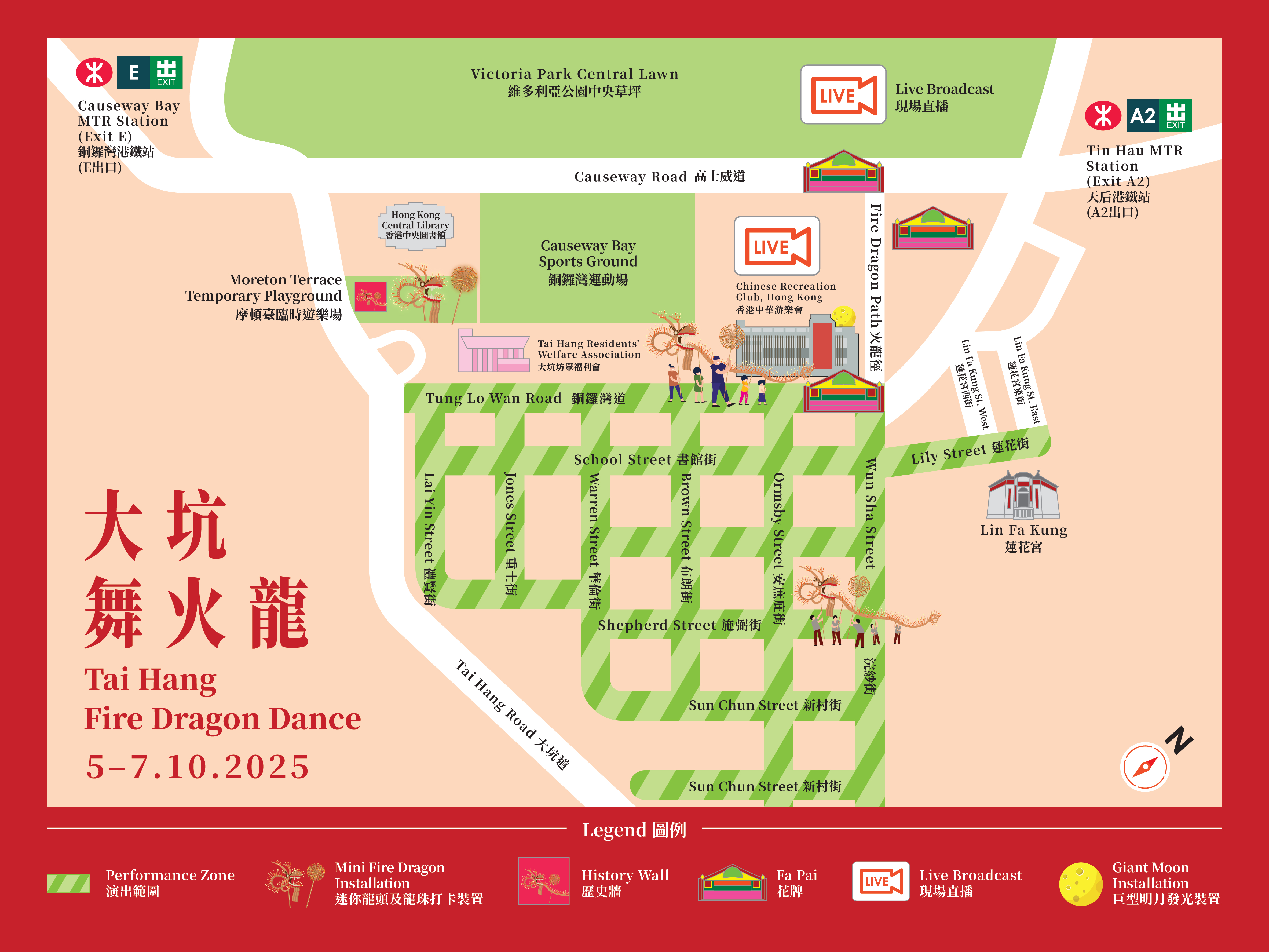 • From MTR Causeway Bay Station, Exit E, walk to Moreton Terrace Temporary Playground to see the mini Fire Dragon installations and history wall of the Tai Hang Fire Dragon Dance before continuing to Wun Sha Street to watch the Fire Dragon Dance.​