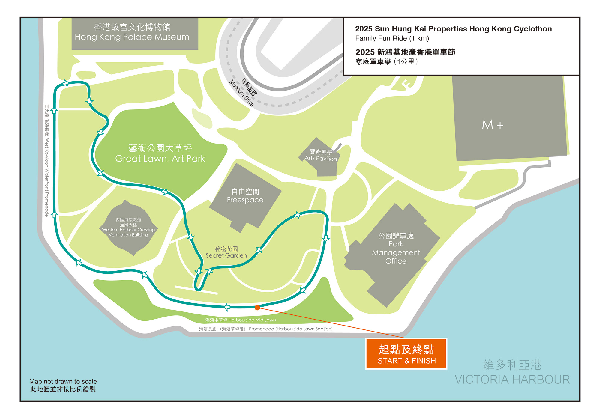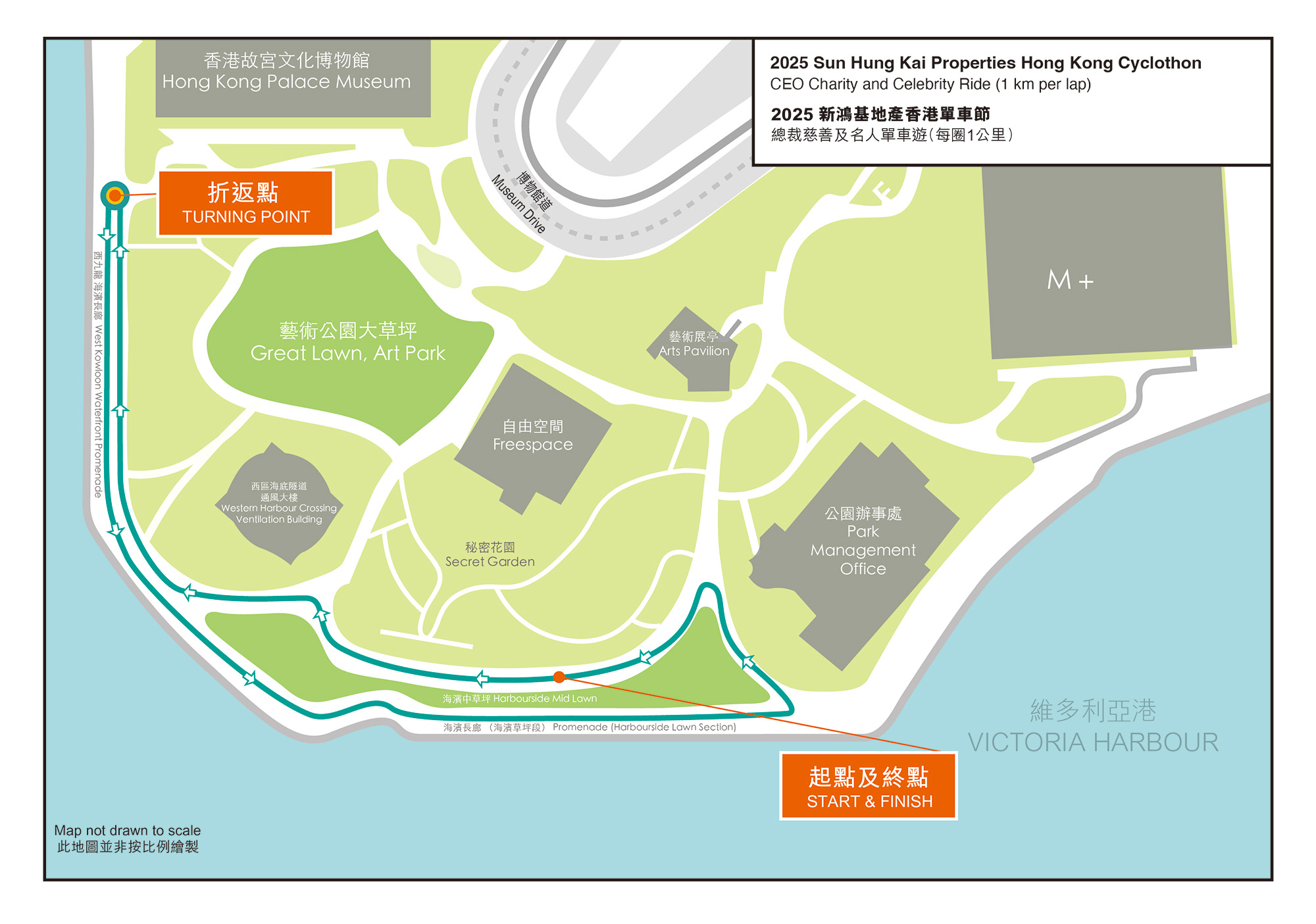 | Route and number of laps: | Two loops around a 1 km route that runs inside the West Kowloon Cultural District. |
