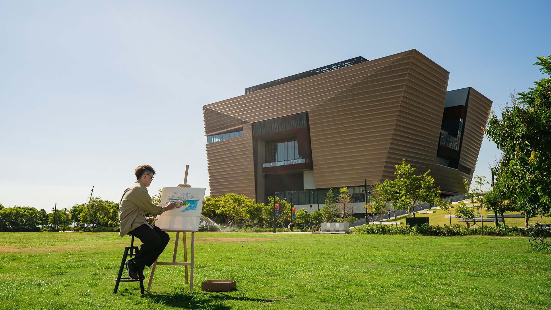 香港故宮承傳紫禁城建築中軸線的概念,設有3個面向不同方位的中庭空間,並與戶外空間相連。遊走於開揚寬敞的中庭,譚澤鴻特別欣賞這裡的線條和採光。「繪畫的第一感覺很重要,走進香港故宮,就會不由自主拿起筆。這裡的線條感很強,尤其是室內的線條,陽光穿透建築映照在地上的斑斕色彩,都經過精心設計。」他特地創作一幅以香港故宮為主題的全景作品,展現故宮建築特色,並將維港景色融入其中。
