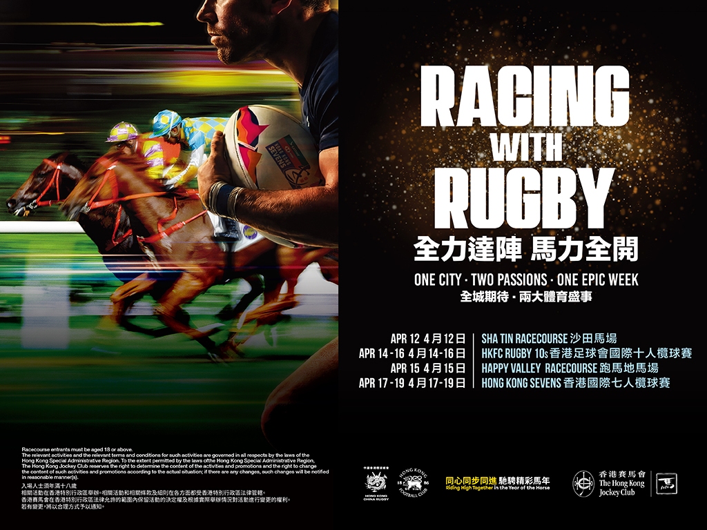 一同體驗香港兩個深受歡迎的運動!4月12日,以欖球為主題的沙田賽馬日,將為「香港欖球週」揭開序幕,屆時將在馬匹亮相圈,公布中國香港男子及女子七人欖球代表隊的陣容名單。緊接著,4月15日的Happy Wednesday,將以欖球主題在跑馬地馬場登場,把賽馬的刺激與欖球的熱情精妙融合。不要錯過這場將賽馬與欖球共冶一爐的盛事!